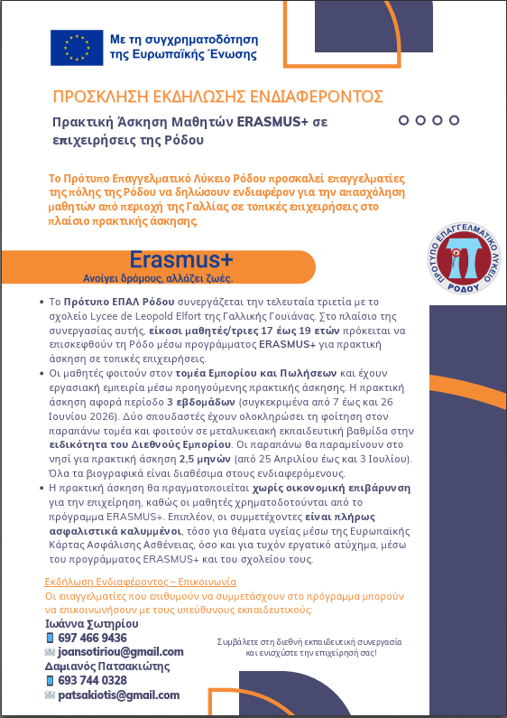 Το Πρότυπο Επαγγελματικό Λύκειο Ρόδου προσκαλεί επαγγελματίες της πόλης της Ρόδου να δηλώσουν ενδιαφέρον για την απασχόληση μαθητών από περιοχή της Γαλλίας σε τοπικές επιχειρήσεις στο πλαίσιο πρακτικής άσκησης.
